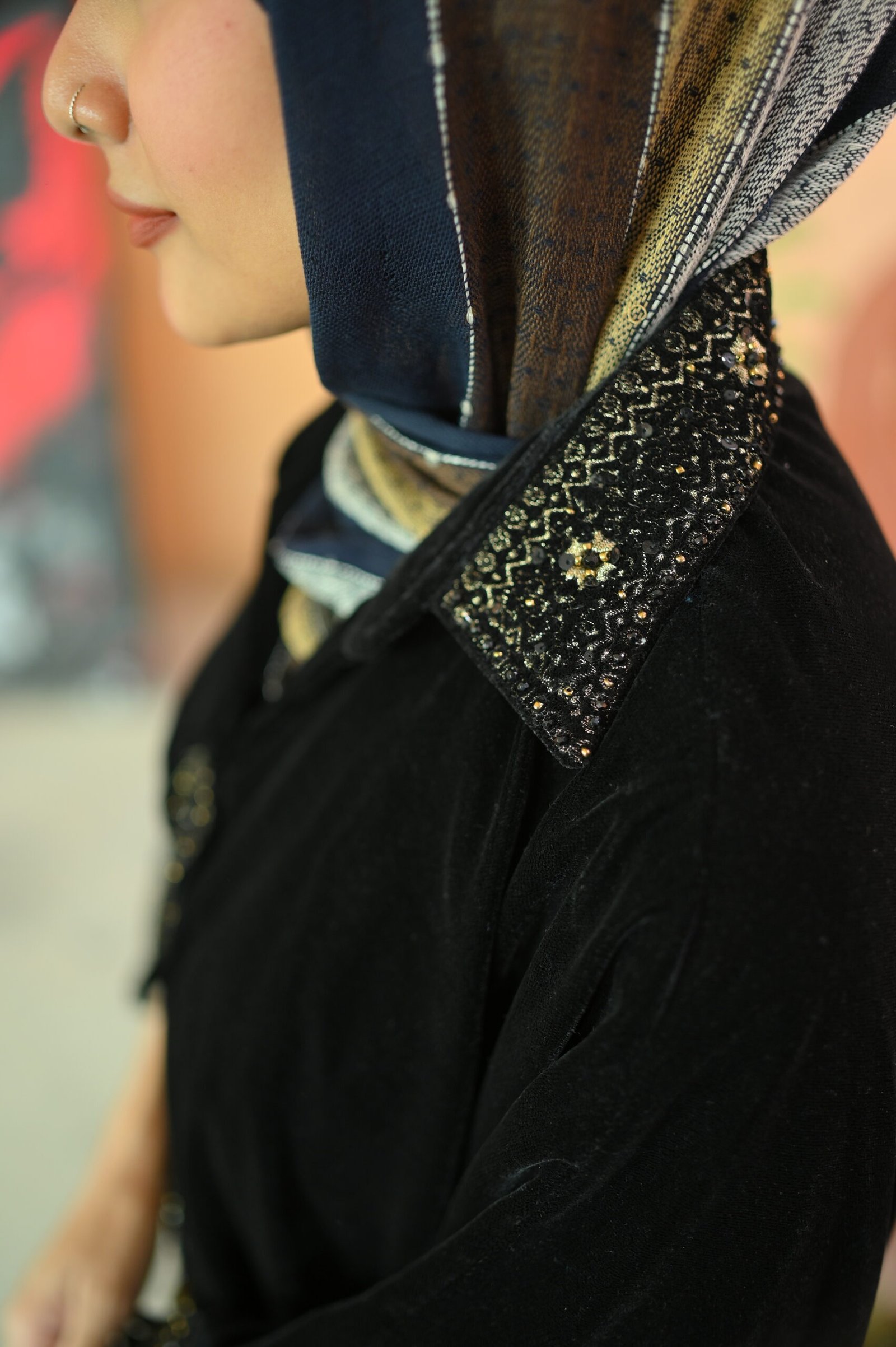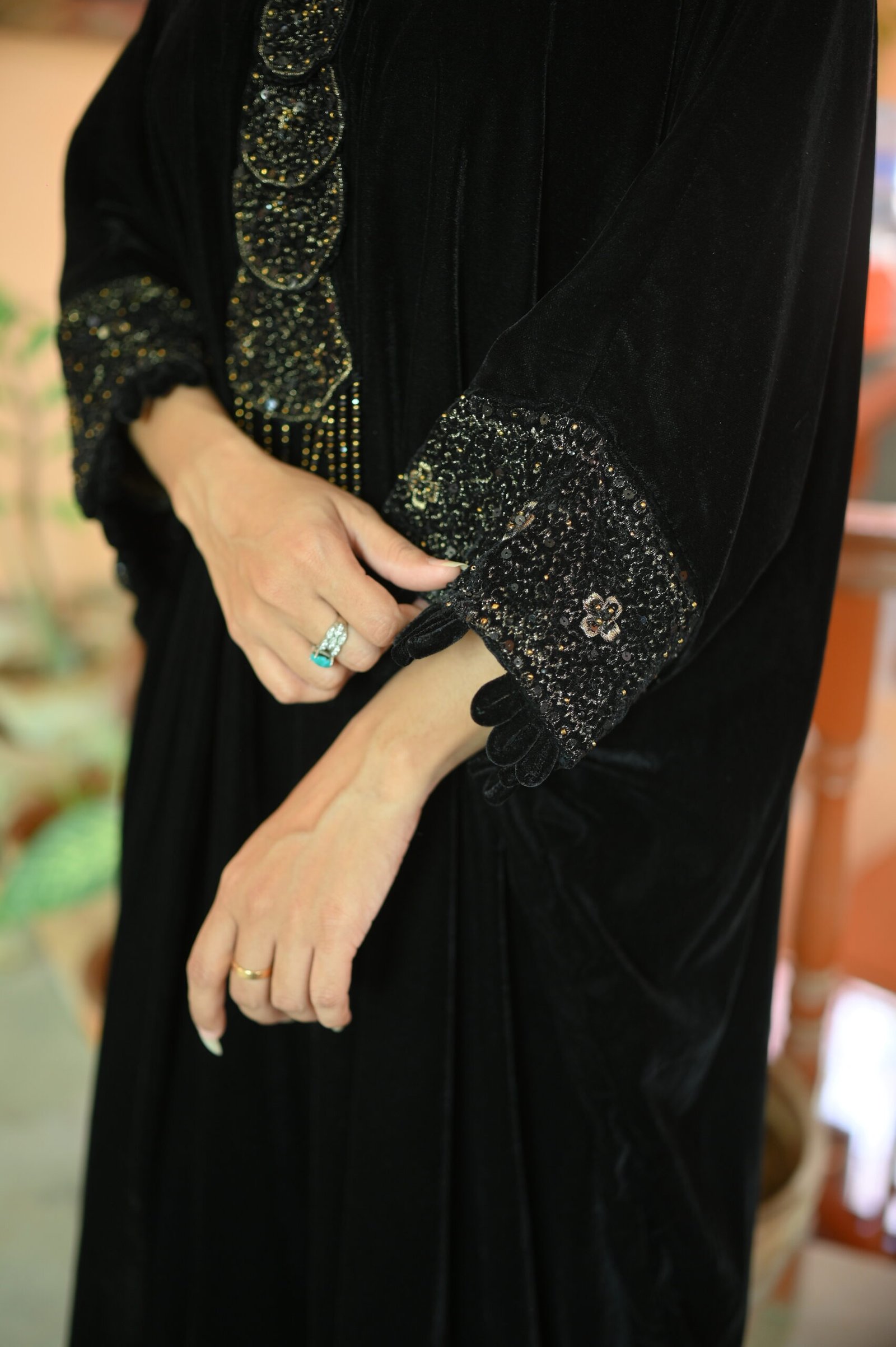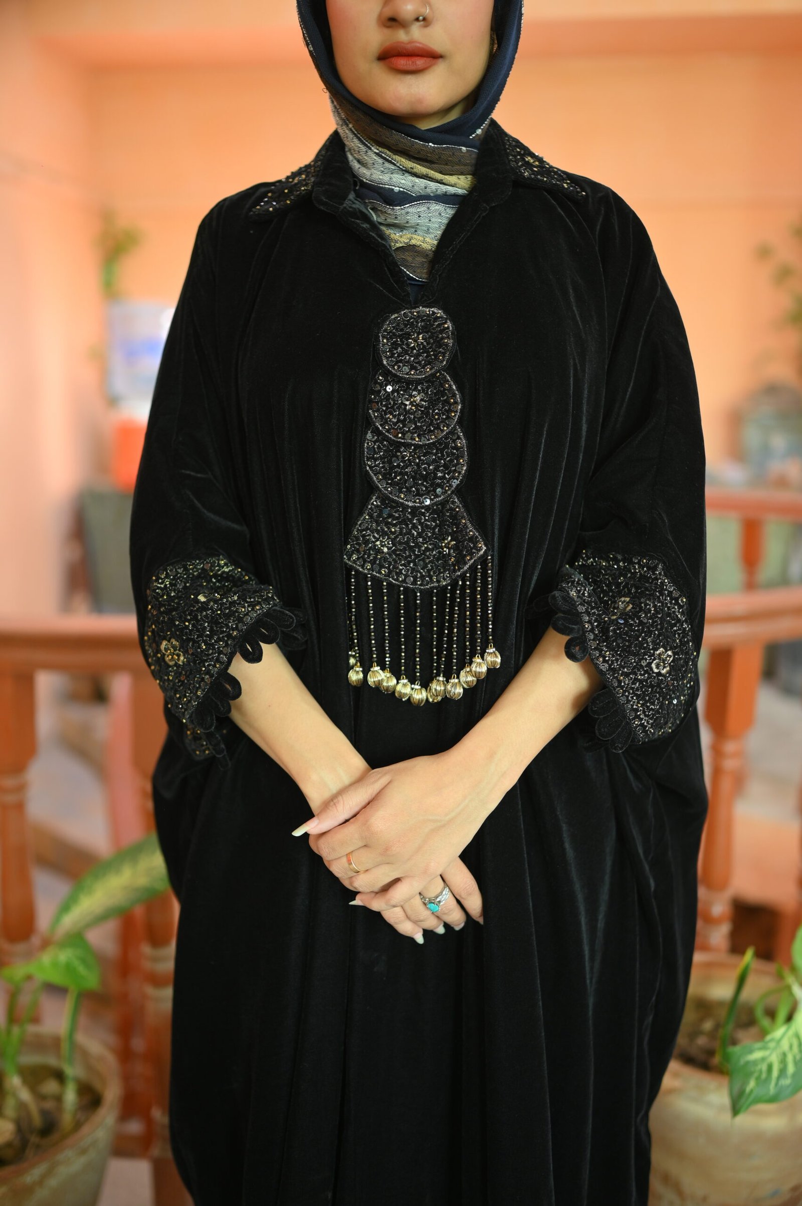 The dress is delicately adorned with intricate embroidery, further enhanced with crystal pearl embellishments that add a subtle touch of elegance and shine. Stylish tassel details complete the look, giving it a graceful and trendy finish.